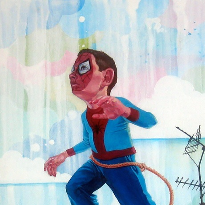 Also, when you are thinking about the particular slice of time you will be representing make sure it is at the most conducive moment in time to tell the whole story. Often this could be right before a decisive moment; here if the painter had chosen to rewind too far to the boy eating breakfast in his Spiderman outfit or putting on the makeup it wouldn’t have the same emotional impact or tension that it has with him on the edge of the building. If we skip forward to him jumping, being rescued etc. the sense of tension – of what’s going to happen would be ruined, it would be the end.